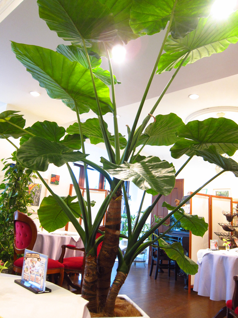 天井に届くほどに高く茂った緑の観葉植物が、あちこちに見えます。