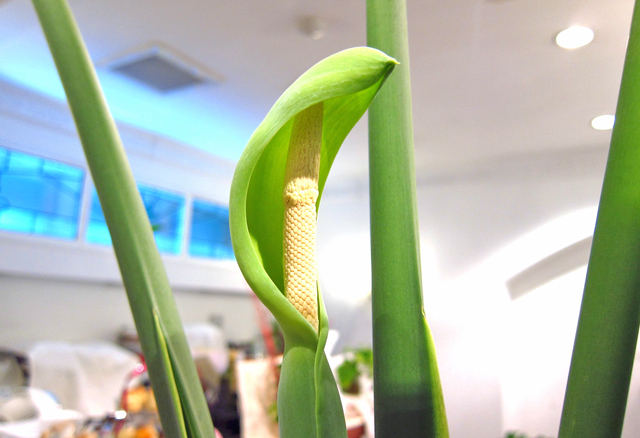 花屋さんをなさっている方が来店されたとき、「クワズイモの花が咲くなんて。しかも冬に……」と驚いて何枚も記念撮影をなさっていました。